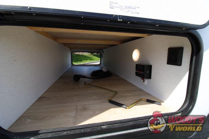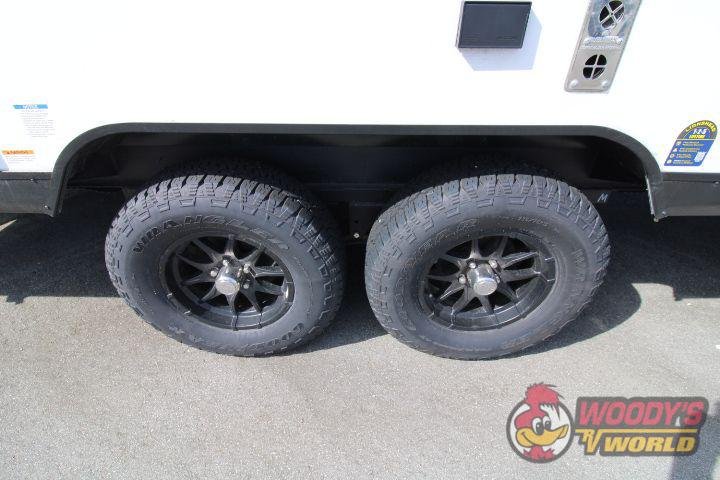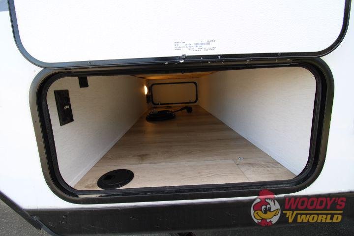 • Exterior Features: Fiberglass Front Cap with LED Lighting and Window, Heated and Enclosed Underbelly, Spare Tire and Carrier, Stabilizer Jacks (4), Power Awning with LED Lighting, Hot/Cold Outside Shower, Black Tank Flush, Solid Step Entry, Radius Glass Friction Hinge Entrance Door