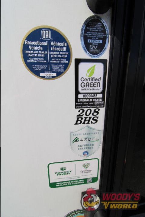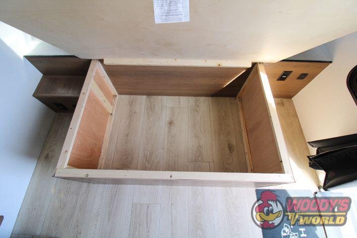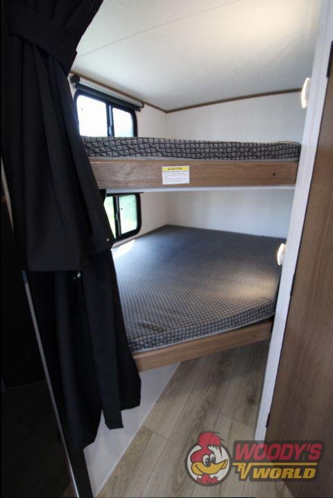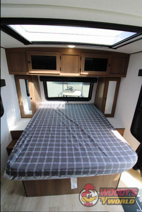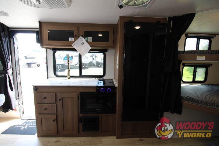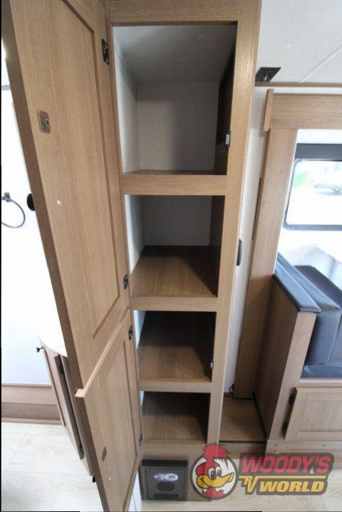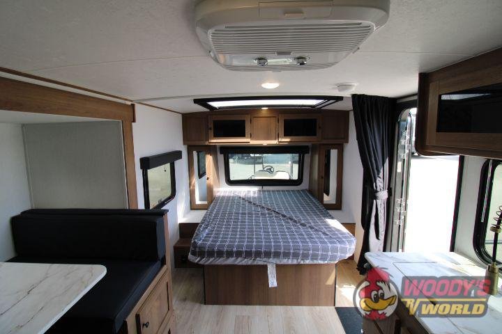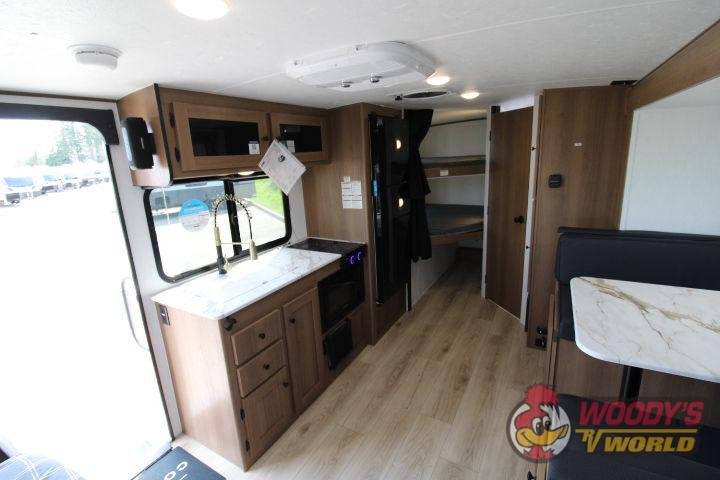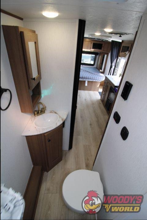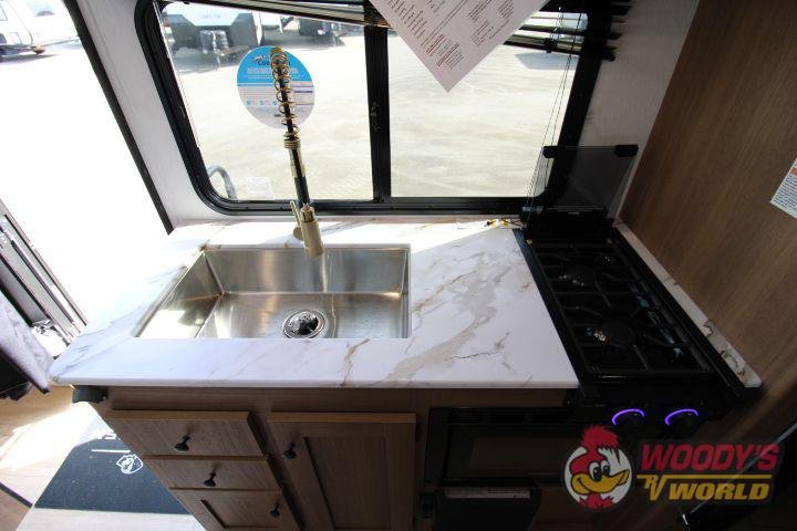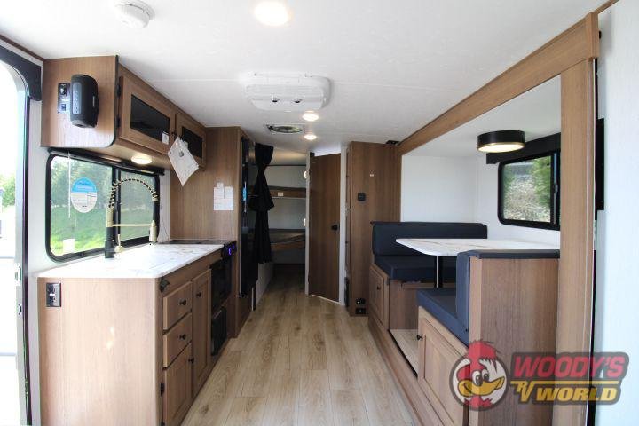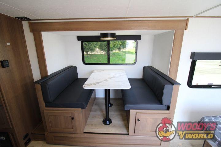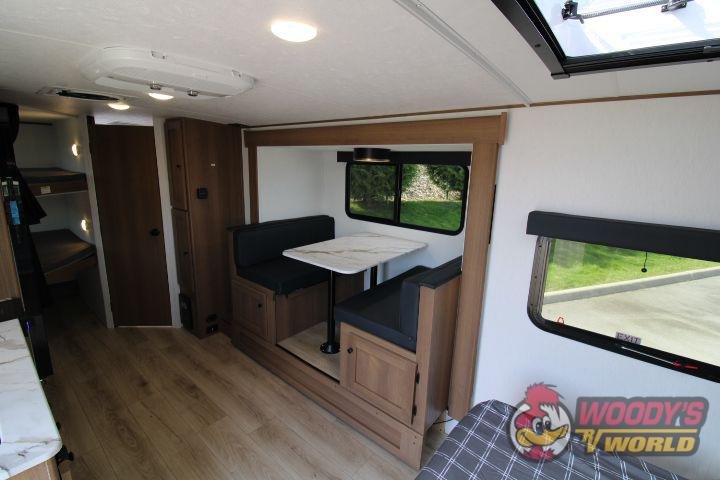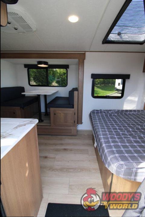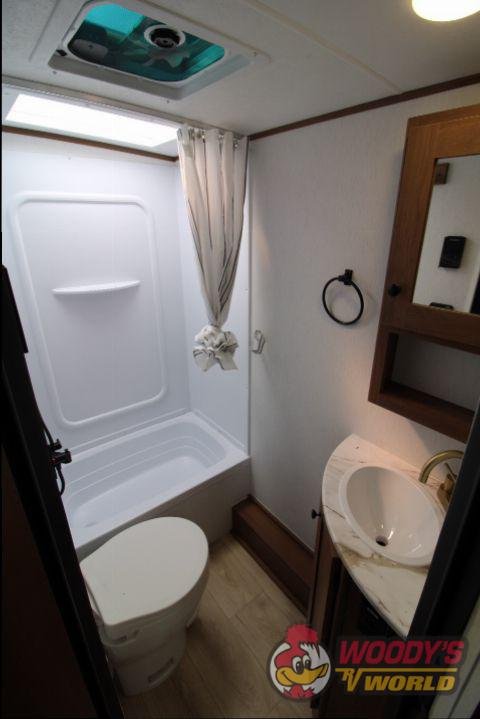 • Interior Features: Casino Bisque Cabinetry, Shaker Cabinet Door Frames with Magnetic Catches, One-Piece Seamless Edge Countertops, Congoleum Residential Flooring, Hard Valances with Night Shades, LED Interior Lighting, Booth Dinette, Stainless Steel Single Bowl Sink with Flush-Mount Cover, Microwave, Air Fryer, Mounted Bluetooth Wireless Speaker, USB Chargers, High Velocity 10" Power Roof Vent, Skylight in Bath, Hand-Crafted Wood Medicine Cabinet, Foot Flush Toilet